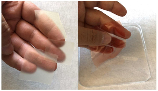 In other studies using “pullulan” as the film-forming polymer, as in our research, the film thickness was determined by Panchal et al., 70 µm [23]; determined by Sharma et al., 100 µm [24]; and determined by Pezik et al., 38–70 µm [25]. It was observed that with a decrease in the film thickness, the polymer degradation accelerated, and thus the release kinetics changed. As seen in Figure 3, the OTF samples appear very homogeneous, thin and transparent. In addition, all OTF thicknesses were found to be 30 µm.