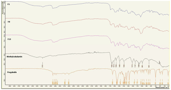 In order to determine whether there were undesirable interactions between formulation components and active ingredients, infrared spectra were taken from pure PG, MC and powder samples of formulations with an FTIR (ATR) spectrometer (Bruker VERTEX 70v, Billerica, MA, USA) in the wavenumber range of 4000–400 cm−1.
