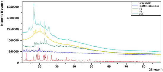 X-ray diffraction analysis helps to determine the crystalline or amorphous nature of the active ingredients used in the films. For this purpose, an X-ray diffractometer (PANalytical Empyrean XRD, Almelo, The Netherlands) with 45 kV voltage and 40 mA current was used to analyze the PG, MC, and conformational sequences in the formulations chosen for this purpose [54].