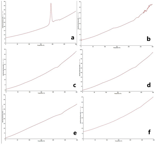 The interactions of PG and MC with excipients were studied to elucidate the thermal properties of the drug to predict any possible physicochemical interactions that might affect the drug release rate or drug release mechanism from polymeric film formulations. The DSC thermograms obtained are given in Figure 7. When the thermograms are examined, a melting peak around 195–200 °C is observed for PG in accordance with the literature (Figure 7a) [36,38]. The characteristic melting endotherm for MC was observed at around 270–280 °C, consistent with the literature (Figure 7b). Characteristic endothermic peaks in the active substances were not observed in the physical mixture and formulations since it suggests the possibility of molecular dispersion by complete amorphization [34].