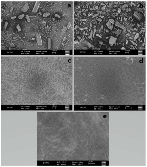 SEM imaging was performed to show the surface morphology of the films (Figure 8). The OTFs showed an irregular but homogeneous surface due to the low extrusion temperature. The surfaces of the prepared PG- and MC-containing hydrogel-based OTFs F5 and F8 were rough (Figure 8c,d). The F13 formulation was smooth. When we look at the literature, it is seen that there are similar film morphologies in similar studies [25]. However, the roughness/smoothness of an OTF does not have any effect on the drug release properties of the film.