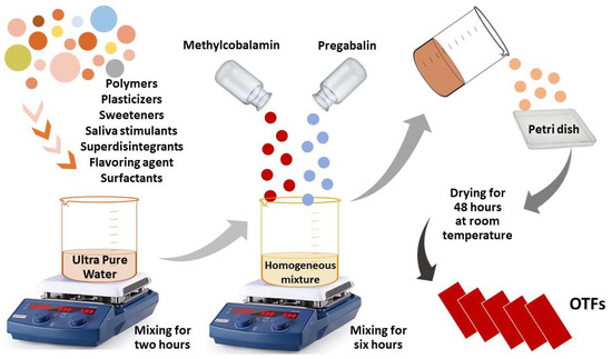 The oral availability of many drugs is inadequate due to gastric pH, enzymes, and extensive first-pass effects through the liver. These drugs have to date been traditionally administered parenterally and have demonstrated low patient compliance. However, some patient groups, especially pediatric and geriatric patients, have difficulty swallowing or chewing solid dosage forms. Many pediatric and geriatric patients are reluctant to take these solid dosage forms for fear of choking. This situation has paved the way for the pharmaceutical industry to develop alternative systems for the transport of drugs by developing orally disintegrating/soluble thin films [1,2,3]. Orally disintegrating/soluble thin films or strips are defined as “drug delivery systems containing a water-soluble polymer that, when placed on the tongue or in the oral cavity, quickly disperses with saliva, dissolves or adheres to the mucous membrane, and releasing the drug within a few seconds” [4,5]. OTFs have a rising market portion today due to their dosage form, ease of administration, and high efficacy [6]. The OTF dosage form has started to be especially preferred in many prescription and over-the-counter preparations and multivitamin combinations [7]. OTFs can be prepared in a variety of ways. The most commonly used and preferred method is the Solvent Pouring Method. In this method, which is also used within the scope of our study, the water-soluble components that make up the OTF formulation are mixed by heating. Afterward, the active substance and other excipients are added to this mixture to obtain a viscous solution. This solution is poured into a petri dish, and the solvents are allowed to evaporate. The advantages of the solvent pouring method include the fact that OTFs are clear and bright, highly flexible, have excellent and thin film thickness uniformity, and are cost-effective [1,8,9].