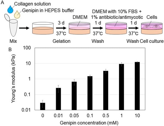 (A) The schematic procedure of preparing genipin-mixed collagen gels for cell culture. HEPES: N-2-hydroxyethylpiperazine-N-2-ethane sulfonic acid, DMEM: Dulbecco’s modified Eagle’s medium, FBS: fetal bovine serum. (B) Young’s moduli of the 0, 0.01, 0.05, 0.1, 0.5, 1, or 10 mM genipin-mixed collagen gels. Mean ± S.D. N = 3 experiments.