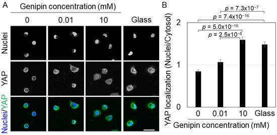 YAP is a transcription factor that is localized to the nuclei of cells on a stiff substrate, whereas it diffuses or localizes to the cytoplasm of cells on a soft substrate [26]. Therefore, we cultured H1299 cells on genipin-mixed collagen gels and collagen-coated glass dishes and observed YAP localization using immunofluorescence staining. On 0 or 0.01 mM genipin-mixed collagen gels, YAP diffused in most cells (Figure 3A). In contrast, YAP localization to the nuclei was strongly induced in cells on 10 mM genipin-mixed collagen gels or glass substrates (Figure 3A). Statistical analysis of YAP nuclear localization showed that YAP was significantly localized to the nuclei of cells on 10 mM genipin-mixed collagen gels and glass dishes (Figure 3B). These results indicate that, similar to cell morphology, H1299 cells respond to the stiffness of genipin-mixed collagen gels and regulate YAP localization.