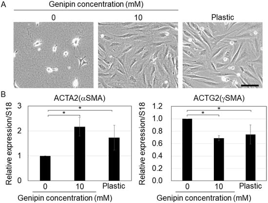 Previous studies have shown that ECM stiffness is critical for the differentiation potential of MSCs [6,26]. Thus, we cultured MSCs on genipin-mixed collagen gels with different stiffnesses and evaluated their differentiation potential. First, we cultured MSCs on genipin-mixed collagen gels and collagen-coated plastic dishes (to control stiff substrates) under smooth muscle differentiation conditions. Our results showed that on 10 mM genipin-mixed collagen gels or plastic substrates, the cells showed spreading morphology, whereas on 0 mM genipin-mixed collagen gels, the cells did not (Figure 4A), suggesting that MSCs responded to the stiffness of each substrate. The qPCR results revealed that ACTA2 (αSMA, a marker of vascular smooth muscle [27]) expression was significantly higher in the cells on 10 mM genipin-mixed collagen gels or plastic dishes, on the other hand, ACTG2 (γSMA, a marker of visceral smooth muscle [27]) expression was significantly lower in the cells on 10 mM genipin-mixed collagen gels or plastic dishes (Figure 4B). We also confirmed that the smooth muscle marker smoothelin (SMTN) [27] was expressed in cells on all substrates, even though the expression level was significantly higher in cells on 0 mM genipin-mixed collagen gels (Figure S2).