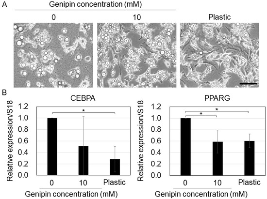 Next, we cultured MSCs on genipin-mixed collagen gels and collagen-coated plastic dishes under adipogenic conditions. On softer substrates, the cells stored larger lipid droplets (Figure 5A). A previous study found that lipid droplets grow large during the differentiation process [30], implying that soft substrates enhance the differentiation of MSCs into adipocytes. The qPCR results showed that the adipogenic markers (CEBPA and PPARG) [31] were downregulated in cells on stiff substrates (10 mM genipin-mixed collagen gels and plastic dishes). A previous study also showed that adipogenic differentiation is promoted in MSCs cultured on soft substrates [26]. Therefore, our results indicate that genipin-mixed collagen gels with different stiffnesses also regulate adipogenic differentiation of MSCs.