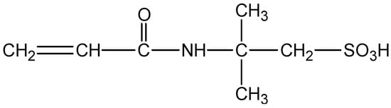 (1) Reagents: The self-crosslinking emulsion thickener was prepared by inverse emulsion polymerization. In a three-necked flask protected by nitrogen gas, add 140 g of silicone oil, 4 g of Span80 and 1 g of OP-10, and stir at high speed for 30 min. Dissolve 40 g of acrylamide, 10 g of 2-acrylamido-2-methylpropanesulfonic acid, and 5 g of dimethyl diallyl ammonium chloride in 140 g of deionized water. After the monomers are completely dissolved, slowly drop them into a three-necked flask, stir while adding dropwise, control the drop rate, finish the drop within 25–30 min, control the stirring speed, use an emulsifier to emulsify for 1.5 h, and keep the state of the water-in-oil emulsion stable. Add 0.05 g of benzoyl peroxide, 0.05 g of azobisisobutyronitrile, and 0.05 g of tert-butyl peroxide to the emulsion at 45 °C for initiation, raise the temperature of the reaction system to 85 °C, and control the reaction at this temperature 14 h after the reaction, the jacket of the reaction vessel was circulated through cooling water, and the temperature was lowered to 25 °C. The white emulsion obtained in the reaction vessel was a self-crosslinking emulsion type fracturing fluid thickener. After the reaction was completed and purified, the conversion rate was 95.6%. The structural formulas of AMPS and the self-crosslinking emulsion-based thickener are shown in Figure 1 and Figure 2. The degree of hydrolysis (mole fraction) and solid content were 23–27% and 88%respectively.