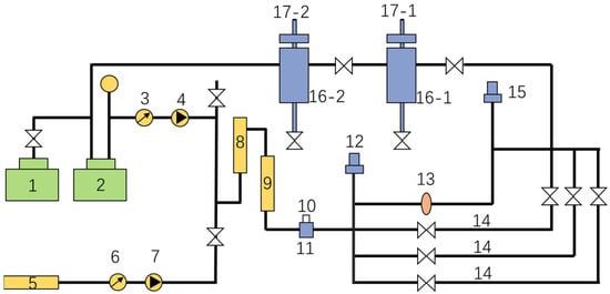 Test device for measuring frictional drag in high-temperature and high-pressure fluid circulation loops. 1—Fluid pressure pump; 2—high pressure container; 3—flow meter; 4—injection pump; 5—thickener storage tank; 6—flow meter; 7—injection pump; 8—blending tank; 9—pipe heater; 10—mass flow meter; 11—pressurizing pump; 12—inlet pressure sensor; 13—pipe viewport; 14—test pipes with diameters of 6 mm, l0 mm, and 14 mm, respectively; 15—outlet pressure sensor; 16—separator; 17—temperature and pressure regulators.