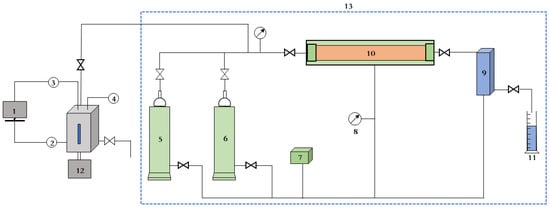 Core damage test system. 1—Temperature and pressure control system; 2—temperature sensor; 3—pressure transducer; 4—magnetic sensor; 5—oil; 6—formation water; 7—constant-flux pump; 8—confining pressure; 9—backpressure valve; 10—core gripper; 11—volumetric cylinder; 12—electrical machine; 13—container.