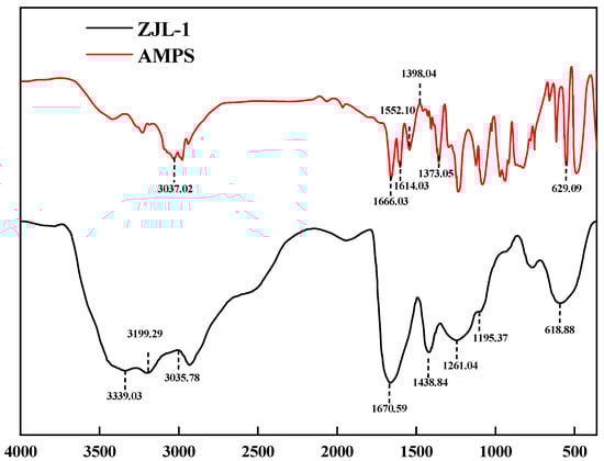 Figure 5 shows the infrared spectrum of AMPS, which exhibited a vinyl =C-H stretching vibration peak at 3037.02 cm−1, a C=C stretching vibration peak at 1666.03 cm−1, and secondary vibrational peaks at 1614.03 cm−1 and 1552.10 cm−1. The characteristic amide II band and amide I absorption bands appeared at 1373.05 cm−1 and 1398 cm−1 for the branched -CH, C-H in-plane bending vibrations, and the peak at 629.09 cm−1 was a characteristic absorption peak for a sulfonic acid group. In the infrared spectrum of ZJL-1, there were two primary amide peaks at 3199.29 cm−1 and 3339.03 cm−1, a peak at 3035.78 cm−1 for the stretching vibration of the vinyl =C-H, a peak at 1670.59 cm−1 for C=C stretching vibration, a sulfonic acid symmetrical stretching vibration peak at 1438.84 cm−1, a secondary amide II stretching vibrational peak at 1261.04 cm−1, a tertiary ammonium vibrational peak at 1195.37 cm−1, and the peak at 618.88 cm−1 1 is characteristic of the sulfonic acid group; the absorption peaks of the AMPS monomer functional groups appeared in the infrared spectrum of ZJL-1, which confirmed that ZJL-1 was chemically modified by AMPS.