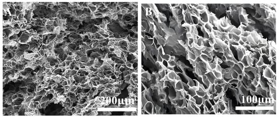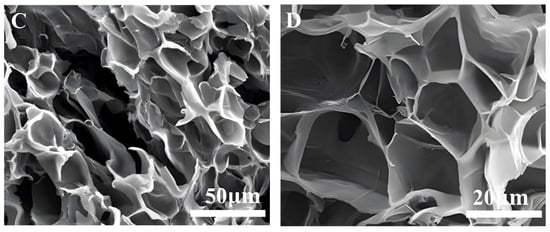 The surface morphology of ZJL-1 was investigated after self-crosslinking using a Thermo Nicolet 380 Scanning Electron Microscope (Massachusetts, USA). ZJL-1 was frozen at −20 °C and then freeze-dried for 24 h. Before SEM observation, the freeze-dried samples were cut open to expose the internal structure of the cross-section, sprayed with gold and then observed [].