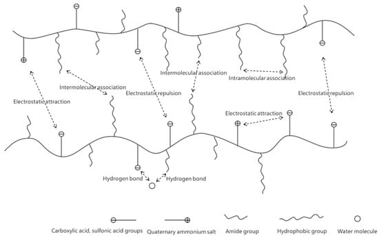 After ZJL-1 was dissolved in water, the carboxyl, sulfonic, and quaternary ammonium salt groups in and between the molecular chains of the copolymer underwent self-crosslinking through ionic bonds, the quaternary ammonium groups in the molecular chains and the sulfonic groups of the anionic emulsifier dissolved in water to form secondary self-crosslinks through ionic bonding, and the long-chain hydrophobic groups in the molecular chains and the nonionic groups of the nonionic emulsifier underwent tertiary self-crosslinking through van der Waals forces and hydrophobic association. In addition, there were strongly polar hydrogen bonds, including H-O bonds and H-N bonds, in the molecular chains, which enhanced the self-crosslinking [,,]. Therefore, ZJL-1 can form a three-dimensional network structure through weak associations, such as hydrogen bonds, ionic bonds, hydrophobic associations, and van der Waals forces, showing good viscoelasticity, as shown in Figure 7. No added crosslinker was needed after dissolution, and various properties were evidently better than those obtained with crosslinked fracturing fluid. This self-crosslinking mode was completely different from other crosslinking modes involving added crosslinker due to the strong covalent bonds (polar covalent bonds, coordinate covalent bonds, etc.,). Crosslinking via chelating bonds is a unique and innovative crosslinking mode [].