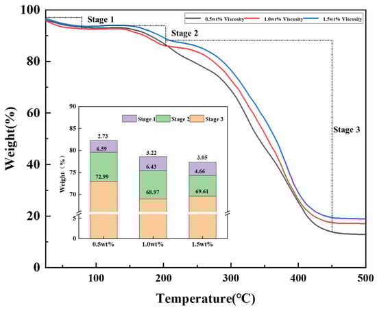As shown in Figure 8, the thermal decomposition temperatures of ZJL-1 were analyzed by using concentrations of 0.5 wt%, 1.0 wt%, and 1.5 wt%, and the graphs show that ZJL-1 went through three weight loss stages for each concentration profile. The first stage occurred between 25 and 80 °C, and the weight loss was generally low; ZJL-1 was ground into a powder and absorbed moisture from the air prior to testing, so this weight loss was due to the volatilization of moisture. When the temperature rose to 80–200 °C, the second weight loss occurred and was mainly due to thermal decomposition of the amide and sulfonic acid groups in the polymer, and the third stage of weight loss occurred between 200 and 450 °C due to thermal decomposition of -SO3H in ZJL-1, which is the largest weight loss observed. As the concentration of ZJL-1 was increased, the total amount of mass lost decreased, with the smallest total mass loss for 1.5 wt% ZJL-1, 7.71%, occurring between 25 and 200 °C. A thermal weight loss of less than 10% for the polymer indicates that the substance is able to withstand the corresponding temperature. The apparent viscosity of ZJL-1 is closely related to the density of the spatial mesh structure, the bond length between molecules, and the entanglement strength of the spatial mesh structure. With the increase of temperature, the intermolecular chemical bonds are gradually broken and this formed reticular structure is gradually destroyed due to the increase of molecular activity. Therefore, the results of the thermogravimetric analyses indicated that ZJL-1 can withstand temperatures up to 200 °C. On the one hand, the existence of the network structure delays the thermal degradation of ZJL-1, and on the other hand, the sulfonic acid group increases the temperature resistance of ZJL-1. The better temperature resistance of ZJL-1 is conducive to maintaining better rheological properties in high temperature environments [].