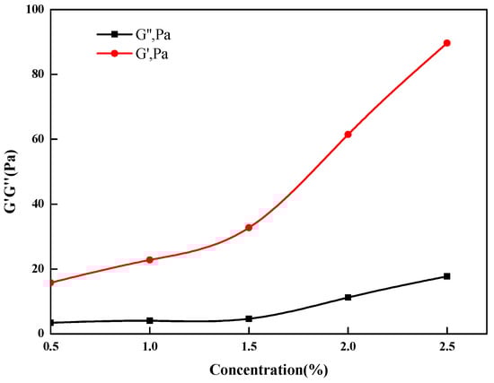 G′ reflects the elastic behavior of a polymer caused by its reticular structure. Decreases in G′ indicate that the elastic behavior of the polymer is weakening. When G′ > G″, it indicates that the polymer exhibits relatively strong elastic behavior. The hydrophobic groups introduced into the molecular structure produce hydrophobic associations, which causes the molecular chains to intertwine, the spatial structure becomes more complex, and the elasticity of the solution is enhanced []. With increases in the thickener concentration, intermolecular association of hydrophobic monomers is enhanced so the hydrodynamic volume of the fracturing fluid increases and the dynamic modulus increases. As shown in Figure 9, each G′ value was higher than the corresponding G″ value in the test concentration range, indicating evident viscoelasticity and stronger spatial reticular structures. The elastic resistance prevents settling of the proppant and improves the sand carrying capability of the fracturing fluid [].