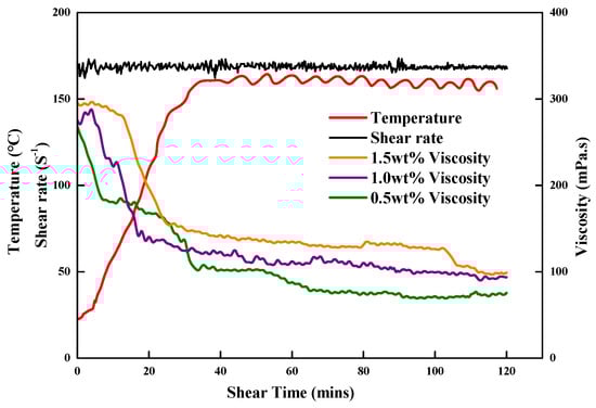 The experiment used a HaakeMars60 rheometer (Karlsruhe, Germany). The reactor inside the rheometer was a steel cylinder, and the pressure of the reactor was 40 MPa, which met the requirements of this experiment. ZJL-1 was poured into the reaction kettle, the temperature control line and the pressure sensing line were connected, the kettle was heated to 160 °C with the external circulation of the water bath, nitrogen was injected into the reaction kettle, the pressure was adjusted to 20 MPa, and the shear speed was set to 170 s−1 for 2 h. The relationship between the apparent viscosity of the fracturing fluid and the time curve was measured [,]. Fracturing fluid must have a viscosity greater than 20 mPa·s to meet the requirements of fracturing fluid transportation proppants [,,].