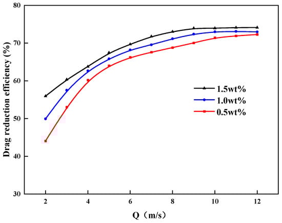 where Dr is the drag reduction efficiency, ∆P1 is the differential pressure when water flows through the pipeline, and ∆P2 is the differential pressure when the ZJL-1 fracturing fluid with added thickener flows through the long pipe. The method employed a pipe with an internal diameter of 10 mm and a test pipeline with a length of 2 m, and the drag reduction efficiency values were tested with different concentrations of thickener added at different flow rates at a temperature of 25 °C and a pressure of 15 Mpa [,].