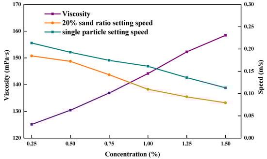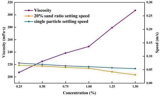 A static sand suspension visible reactor was used. ZJL-1 was fully dissolved in water with stirring. Settling of the proppant in the ZJL-1 fracturing fluid with different thickener concentrations was observed using the indoor static observation method [], and the settling speed of the proppant in the ZJL-1 fracturing fluid was analyzed. The experimental temperature was 25 °C, the pressure was 15 MPa, 30/50 mesh ceramsite proppant was selected, the density of the proppant was 1.3 g/cm3, and the rotational speed of the stirrer was 1000 rpm [].