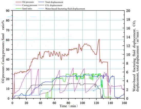 In July 2020, quasi-dry CO2 fracturing construction was carried out smoothly at S Oilfield Well XX-Xie 1. The process flow was divided into two parts: one part involved pressurizing liquid CO2 and pumping it to the wellhead, and the other part involved blending clean water, ZJL-1, a hydrophobic long-chain ester-based thickener, proppant and gel breaker with a fracturing blender truck to form the proppant mortar with high viscoelasticity, which was pumped to the wellhead. These two pumped liquids converged at the tee of the wellhead, formed a mixed liquid phase with sufficient viscosity and structure under turbulent conditions to carry out fracturing construction with integrated drag reduction and sand carrying. In this construction, the amount of liquid CO2 fracturing fluid consumed was 350 m3 in total, the amount of ZJL-1 fracturing fluid consumed was 150 m3, the amount of sand added was 40 m3, the construction pressure was 25–60 MPa, the fracturing pressure was 47.5 Mpa, the liquid CO2 fracturing fluid injection displacement was 4.5 m3/min, the ZJL-1 fracturing fluid injection displacement was 2.0 m3/min, the shut-in pressure was 29 Mpa, the mean sand ratio was 18%, and the maximum sand ratio was 25%. The actual construction parameters and the design parameters were relatively highly matched, and the fracturing construction parameters and construction curves are shown in Figure 14. After the fracturing measurements were taken, the daily fluid production was determined to be 16.5 m3, the daily oil production was 10.2 m3, the daily gas production was 2.5 × 104 m3, the flowback period was 10 days, and the flowback rate was 120%. The field application showed that the production rate of this well was increased with this fracturing mode as compared with the use of the previous fracturing mode. The daily oil production per single well doubled, and the daily gas production increased by a factor of 6.5 with the evident oil production increase.