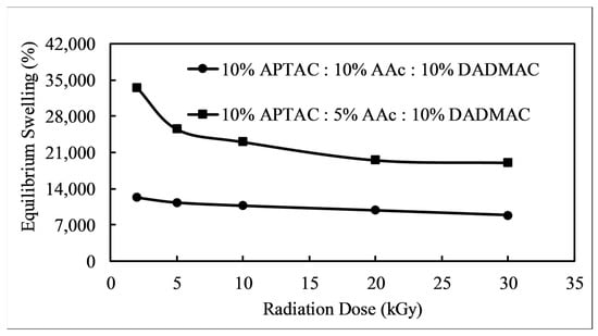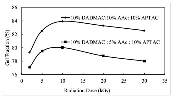 Gel fraction is the amount of gel produced and extracted by removing unreacted contaminants from the gel network. Figure 1 shows the effect of radiation dose on the gel production during the reaction among monomers. The figure indicates the smaller gel production at a lower dose following the increasing trend till 10 kGy, then starts decreasing []. At lower radiation doses, all the particles of raw materials cannot be activated for the reaction which lessens the gel fraction [,]. The figure also reflects the effect of the concentration of monomers where the higher concentration (10%) of acrylic acid in the blend solution gives a higher gel fraction compared to the lower concentration (5% acrylic acid). This is due to the greater number of grafting and cross-linking among the monomers as a larger number of molecules feel irradiation. Owing to the steric hindrance, all of the free radicals of larger monomers cannot propagate to produce their own homo-polymer. Acrylic acid is a smaller monomer than APTAC and DADMAC, which is why it can link the big monomers giving the cross-linked and grafted copolymers.