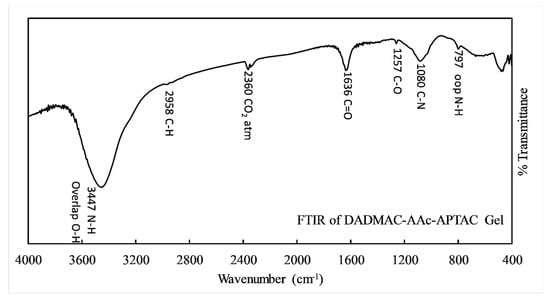 FTIR spectroscopy of DADMAC-Aac-APTAC gel was measured by using the KBr reference. Figure 4 Presents the spectrum of gel which indicates the peak at 3447 cm−1 for N-H stretching of secondary amide overlapping with O-H of carboxylic acid. The peak at 2958 cm−1 is for C-H stretching. The other characteristic peaks at 1636 cm−1 for –C=O of tertiary amide, 1257 cm−1 (medium intensity) for C-O of carboxylic acid, 1080 cm−1 for –C-N stretching of tertiary amide and 797 cm−1 for -N-H out of plane bending []. Thus, the presence of –N-H and –C-N peaks belong to the amide group which indicates the copolymerization between DADMAC and APTAC monomers via acrylic acid linkage.