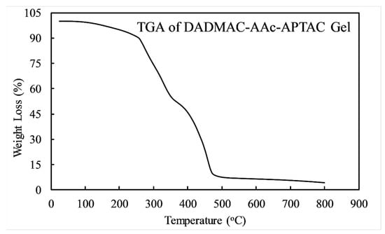 TGA graph of DADMAC-AAc-APTAC gel prepared by 2 kGy radiation dose.
