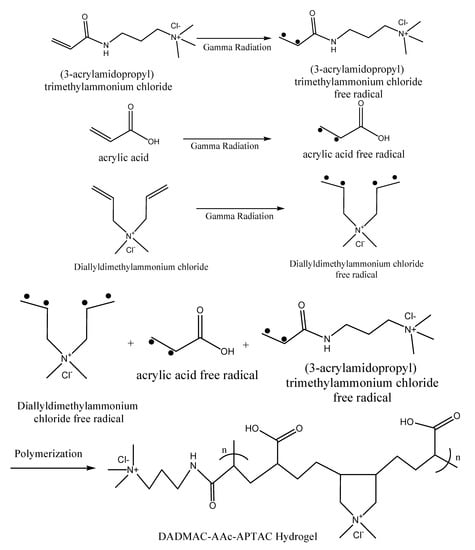 Radiation polymerization gives a pure yield because of not using the cross-linking agent and initiator. In this work, radiation from the Cobalt-60 source was applied and synthesized gels. Gamma radiation interacts with the vinyl part of the raw materials to produce free radicals which propagate and terminate to yield the final polymeric gel. Gamma radiation was irradiated on the blend solution of different compositions of monomers. The solution of DADMAC and APTAC does not give directly hydrogel products upon irradiation. However, in presence of AAc, they undergo gel formation which can be attributed to the bulky groups of APTAC and DADMAC hindering the movement of monomers to get close proximity and collision for proceeding with the reaction []. Small group AAc is turned into free radicals and acts as a linker between two big crowded monomers []. Scheme 1 shows the probable radiation polymerization in aqueous media.