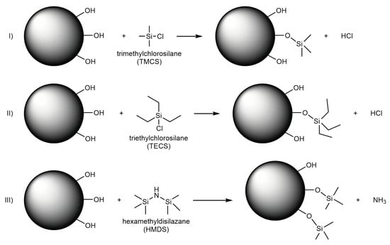 All silylation agents lead to surface hydrophobization by modification with surface silanol end groups, as depicted schematically in Figure 1, splitting off either hydrochloric acid or ammonia. Whereas modification by TECS results in triethylsilyl (TES) end groups, TMCS and HMDS silylation lead to trimethylsilyl (TMS) groups. However, TMCS and HMDS show differences in reactivity [27], and it was reported that HMDS could undergo two different reaction mechanisms during silylation [38]. These differences in reaction mechanisms or steric hindrances because of differences in molecular sizes could lead to influences on the springback behavior.