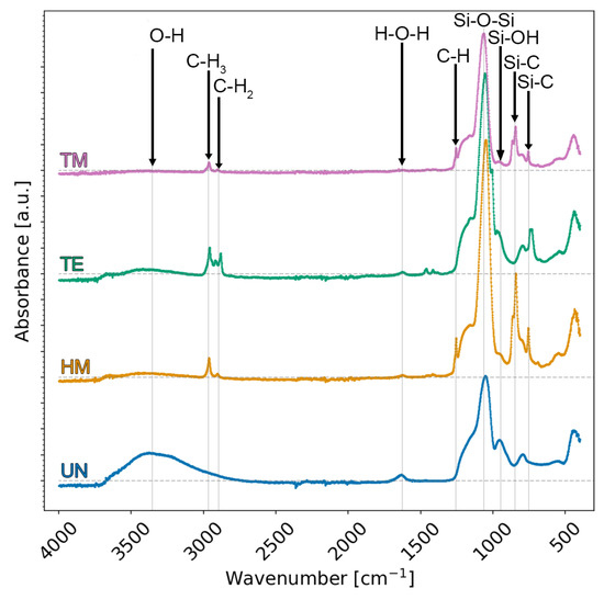 ATR-FTIR spectra were collected on the unmodified UN (blue), hexamethyldisilazane-modified HM (orange), triethylchlorosilane-modified TE (green), and trimethylchlorosilane-modified TM samples (pink) after APD. The modified samples showed typical bands for silylation.