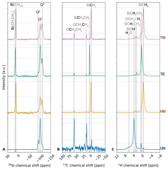 (A) 29Si, (B) 13C, and (C) 1H NMR spectra of the unmodified UN (blue), hexamethyldisilazane-modified HM (orange), triethylchlorosilane-modified TE (green), and trimethylchlorosilane-modified TM samples (pink). A vertical shift was used for better visibility and a grey dotted baseline is shown.