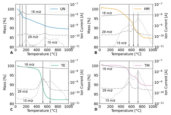 TGA measurements coupled with MS for the (A) unmodified UN (blue), (B) hexamethyldisilazane-modified HM (orange), (C) triethylchlorosilane-modified TE (green), and (D) trimethylchlorosilane-modified TM samples (pink). The ion current of the MS measurement is shown for selected molecular weights of 18 m/z (solid), 15 m/z (dot), and 29 m/z (dash-dot). A vertical black line was drawn to highlight changes in the MS measurements.