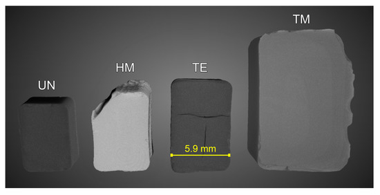The samples as they appear in the Dragonfly software after segmentation. From left to right, the unmodified UN, hexamethyldisilazane-modified HM, triethylchlorosilane-modified TE, and trimethylchlorosilane-modified TM samples are shown. One dataset from each surface modification batch was selected. Additionally, a scale bar was added for the TE sample for visualization.