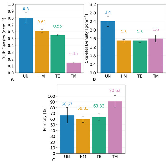 Evaluations of the unmodified UN (blue), hexamethyldisilazane-modified HM (orange), triethylchlorosilane-modified TE (green), and trimethylchlorosilane-modified TM (pink) samples for (A) the bulk density measured by µCT; (B) the skeletal density determined by helium pycnometry; (C) the porosity calculated from the measurements of the bulk and skeletal density shown with their respective errors. The measurements show decreasing bulk densities in the order of the UN, the HM, the TE, and the TM samples, indicating a strong influence of surface modification.
