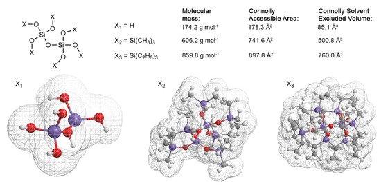 Sketch of the influences of a surface modification on an unmodified sample (X1), via TMCS or HMDS (X2) or TECS (X3) on the overall molecular structure. Here, a chain with two silica atoms is shown with the calculated molecular masses, accessible areas, and Connolly volume inaccessible by a solvent with a radius of 0.5 Å. The grid of the 3D structures represents the volume inaccessible by this solvent. This illustration is a simplification and values should be considered with care.