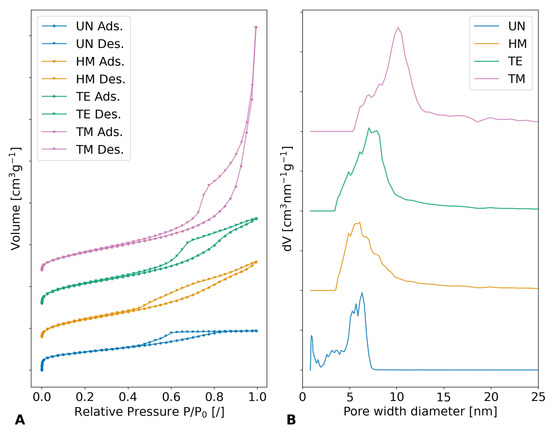 Results with a vertical shift of the unmodified UN (blue), hexamethyldisilazane-modified HM (orange), triethylchlorosilane-modified TE (green), and trimethylchlorosilane-modified TM (pink) samples of (A) nitrogen adsorption (Ads.) and desorption (Des.) isotherms, as well as their respective specific surface areas; (B) the NLDFT evaluations with equilibrium model and cylindrical pore geometry. The pore width diameter showed an overall decrease in the order of the TM, the TE, the HM, and the UN samples, while a noticeable change in isotherms was visible.