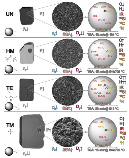 In this work, we have demonstrated that surface silylation significantly influences the drying behavior of silica gels. For that purpose, the unmodified UN, hexamethyldisilazane-modified HM, triethylchlorosilane-modified TE, and trimethylchlorosilane-modified TM monolithic samples were synthesized and characterized by several complementary methods. Figure 10 summarizes the main difference between the studied specimens with respect to their drying behavior, chemical composition, density, porosity, and microstructure. Additionally, the majority of parameters are shown in Table S6.