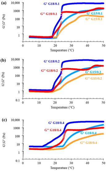 In order to better investigate the capability of x-gum to decrease p-407 gelation temperature, the gel rheological viscoelastic behavior was studied, measuring the elastic modulus G′ and the viscous modulus G″. The former indicates the stored elastic energy reflecting the solid-like component of elastic behavior, whereas the latter indicates the dissipated loss of energy, reflecting the loss or viscous modulus [28]. Figure 2 displays the the G15 and G18 variation of elastic and viscous moduli G′ and G″, as a function of temperature, under the addition of x-gum 0.1, 0.2, or 0.4%, w/w, and Table 2 reports the obtained rheological parameters.