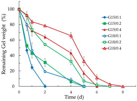 Erosion profiles of G15/0.1, G15/0.2, G15/0.4, G18/0.1, G18/0.2, and G18/0.4 at 37 °C. Results are shown as the percentage of remaining gel weight as a function of time. Data are the mean of three experiments ± s.d.