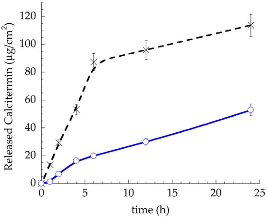 The influence of gel-loading on Cal release was evaluated by comparing G18/0.4 Cal (0.25 mg/mL) and a Cal solution (0.25 mg/mL) in lactate buffer, pH 4.5 (Sol Cal), using Franz cell associated with a synthetic polymeric membrane constituted of nylon. Despite animal mucosae can yield more predictable results with respect to synthetic membranes, their use involves several drawbacks due to their availability, ethical restrictions, variable results, and risks of contamination. Conversely, FDA suggests the use of synthetic membranes by Franz cell tests to compare topical forms or for quality control, being chemically inert and commercially available, and providing highly reproducible results [49,50,51].