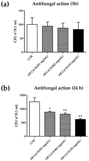 After 24 h of contact, the reduction was more evident and AB Cal reduced C. albicans CFUs of 30% (p < 0.01), 35% (p < 0.01), and 51% (p < 0.01) as compared to controls, respectively, at 0.031, 0.062, and 0.125 mg/mL. The results obtained at both timepoints are depicted in Figure 6.