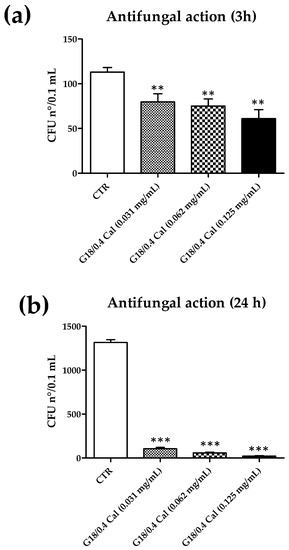 Antifungal activity of G18/0.4 Cal. (a) Effect after 3 h of contact. (b) Effect after 24 h of contact. CTR, control yeasts receiving G18/0.4 gel without Cal; CFU, colony forming units. Results are expressed as mean value of CFUs ± s.d. obtained from triplicate samples from two independent experiments; ** p value < 0.01; *** p values < 0.001.