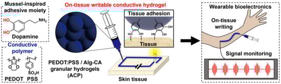 Herein, we report a new type of conductive and adhesive granular hydrogel that can be directly written onto the tissue (Figure 1). Using alginate-based tissue-adhesive polymers with mussel-inspired catechol moieties (e.g., catechol-conjugated alginate; Alg-CA), we fabricated a tissue-adhesive granular hydrogel (e.g., a microgel) via an electrohydrodynamic spraying strategy, which is a facile and time-saving technique compared with that of a microfluidic device []. To improve its electrical conductivity, we introduced PEDOT:PSS into the microgel. The granular structure can enhance the surface area that each PEDOT:PSS/Alg-CA microgel contacts, allowing great conductivity of the hydrogels by the continuous electrical flow. The fabricated PEDOT:PSS/Alg-CA granular hydrogel (ACP) also exhibits tissue-adhesive properties via hydrogen bonding or covalent bonding between the functional groups of the tissue surface and catechol moieties of hydrogels [,,]. Such adhesiveness between the ACP hydrogels and tissue interfaces enables on-skin printing of the hydrogels. Thus, the enhanced conductivity and intrinsic injectability of the ACP make it a promising material for flexible bioelectronics [,,]. Ultimately, when compared with conventional bulk hydrogels, such conductive and adhesive granular hydrogels can be potential candidate materials for soft electrodes with great printability/injectability, high gas permeability, and biocompatibility for future wearable on-skin bioelectronics.