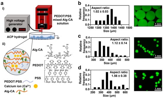 To fabricate the Alg bead, AC, and ACPs, a 2% (w/v) calcium chloride solution was prepared using deionized water. The lyophilized Alg-CA polymer (30 mg) and the PEDOT:PSS solution (1% stock solution) were used. A total of 0.5 mL of 1% PEDOT:PSS stock solution was mixed with 0.5 mL of deionized water to make 0.5% PEDOT:PSS solution. To fabricate ACP0.5 and ACP1, 30 mg of Alg-CA were dissolved in 0.5% (for ACP0.5) and 1% (for ACP1) PEDOT:PSS solution. To obtain the AC and ACPs, each of prepared solutions was dropped into a CaCl2 solution through a 26-gauge needle using a syringe pump (flow rate: 0.1 mL·min−1, NE-1000, New Era Pump Systems Inc., New York, NY, USA) and a DC high-voltage generator (NNC-HV30, Seoul, Republic of Korea); the distance between the needle tip and the collecting bath was 10 cm.