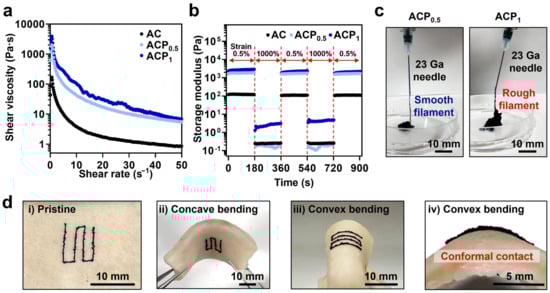 Injectability characterization of AC and ACP. (a) Shear-thinning behavior of AC and ACP. (b) Self-healing properties of AC (black), ACP0.5 (light blue), and ACP1 (blue). Storage modulus was plotted with filled circles. (c) Injection of ACPs using a 23 Ga needle. (d) Bending of ACP0.5 printed on the porcine skin tissue in the concave or convex directions.