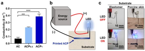 Electrical characterization of AC and ACPs. (a) Conductivity of AC (black), ACP0.5 (light blue), and ACP1 (dark blue). (b) Schematic of LED-emitting experiment on variable substrates. (c) LED emission in electrical circuit serially connected with ACP1 printed on elastomer substrate and porcine skin substrate. One-way ANOVA, *** p < 0.001, **** p < 0.0001.