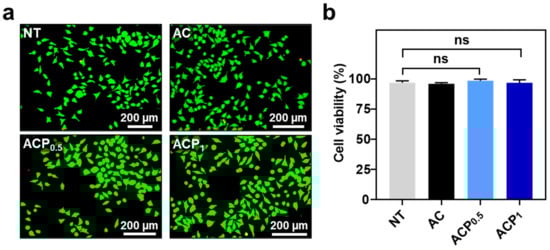 In vitro cytotoxicity of AC and ACPs. (a) Fluorescent images of L929 cells at 24 h after the treatment of the elutes (0.1×) from AC, ACP0.5, and ACP1. ‘NT’ as none of treatment. (b) Quantitative analysis of the cell viability (%). One-way ANOVA. ‘ns’ means ‘not significant’.