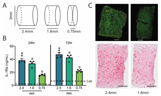 To determine the effects of construct thickness on IL-1Ra production, we created cylindrical (3 mm diameter) agarose gels with three different thicknesses (2.4 mm, 1.6 mm, and 0.75 mm) (Figure 1A) that were seeded with Ccl2-IL1Ra iPSCs at 2 × 106, 1.5 × 106, and 0.75 × 106 cells, respectively, to achieve the same cell density per construct (100 × 106 cells/mL).