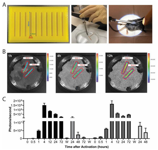 (A) Custom-designed molds (left) were 3D-printed to generate cell-laden agarose rod constructs, which were aspirated into a wide-bore needle (middle) for minimally-invasive implantation subcutaneously through a small dorsal incision (right). (B) Ccl2-luc agarose rod constructs were challenged with 1 ng/mL IL-1α imaged via IVIS to observe activation over time, shown here is a time course of the same two constructs at 1 h, 4 h, and 12 h post IL-1α challenge. (C) Constructs showed robust activation with repeated washout (designated “W”) and reactivation with 1 ng/mL IL-1α. n = 2–6 samples/group/timepoint.