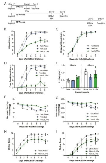 (A) Timeline showing in vivo K/BxN serum transfer arthritis (STA) studies at 1 week, 10 weeks, or 28 weeks post-subcutaneous implantation of Ccl2-IL1Ra agarose rods. Clinical scores of K/BxN STA animals 1 week after implantation of Ccl2-luc or Ccl2-IL1Ra agarose rods over 6 days of observation for (B) overall clinical scores, (C) hindpaws and (D) front paws. (E) IL-1Ra levels in serum at day 2 post K/BxN serum challenge, as measured by ELISA. IL1Ra constructs significantly mitigated mechanical allodynia by (F) Electronic von Frey and (G) pressure-pain hyperalgesia. STA overall clinical scores (H) 10 weeks and (I) 28 weeks after implantation of Ccl2-IL1Ra agarose rods. Note that the degree of disease mitigation observed after 28 weeks is similar to mitigation 1 week after implantation. Different letters indicate significant main effects of group, p < 0.05. N = 3–6/group, data were analyzed by 2-way repeated measures ANOVA with Dunnet’s or Tukey’s post-hoc test. Different letters indicate main effect of group p < 0.05.
