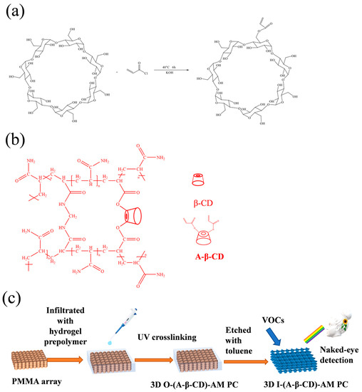 (a) The synthetic route of A-β-CD; (b) the chemical structure of the hydrogel formed by free radical polymerization; (c) schematic illustration of the (A-β-CD)-AM PC preparation.