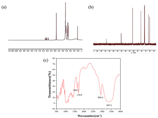 The -OH of two primary alcohol hydroxyl groups on the smaller diameter face of the β-CD cavity was fractured and β-CD was combined with acryloyl chloride in the presence of KOH as shown in Figure 1a. Synthetic cyclodextrins contain -C=C- bonds to act as cross-linking agents in hydrogel components by free radical polymerization [44] as shown in Figure 1b. The obtained A-β-CD was dissolved in dimethyl sulfoxide (DMSO) for NMR analysis. The hydrogen NMR spectrum is shown in Figure 2a. 1H NMR (400 MHz, DMSO-d6) δ:6.40–6.18 (m, 1H), 4.84 (s, 3H), 3.64 (s, 3H), 3.55 (s, 1H), 2.09 (s, 0H) ppm. The carbon nuclear magnetic resonance spectrum is shown in Figure 2b. 13C NMR (101 MHz, DMSO-d6), δ:167.39, 131.23, 129.95, 102.38, 81.98, 73.53, 72.88, 72.49, 63.25, 60.38 ppm. The FTIR of A-β-CD measured by potassium bromide tablet is shown in Figure 2c. FTIR (KBr), v/cm−1: 3457.5, 2921.6, 1725.9, 1624.3. Among them, 1725.9 cm−1 is the -C=O- stretching vibration absorption peak, and 1624.3 cm−1 is the -C=C- stretching vibration absorption peak.